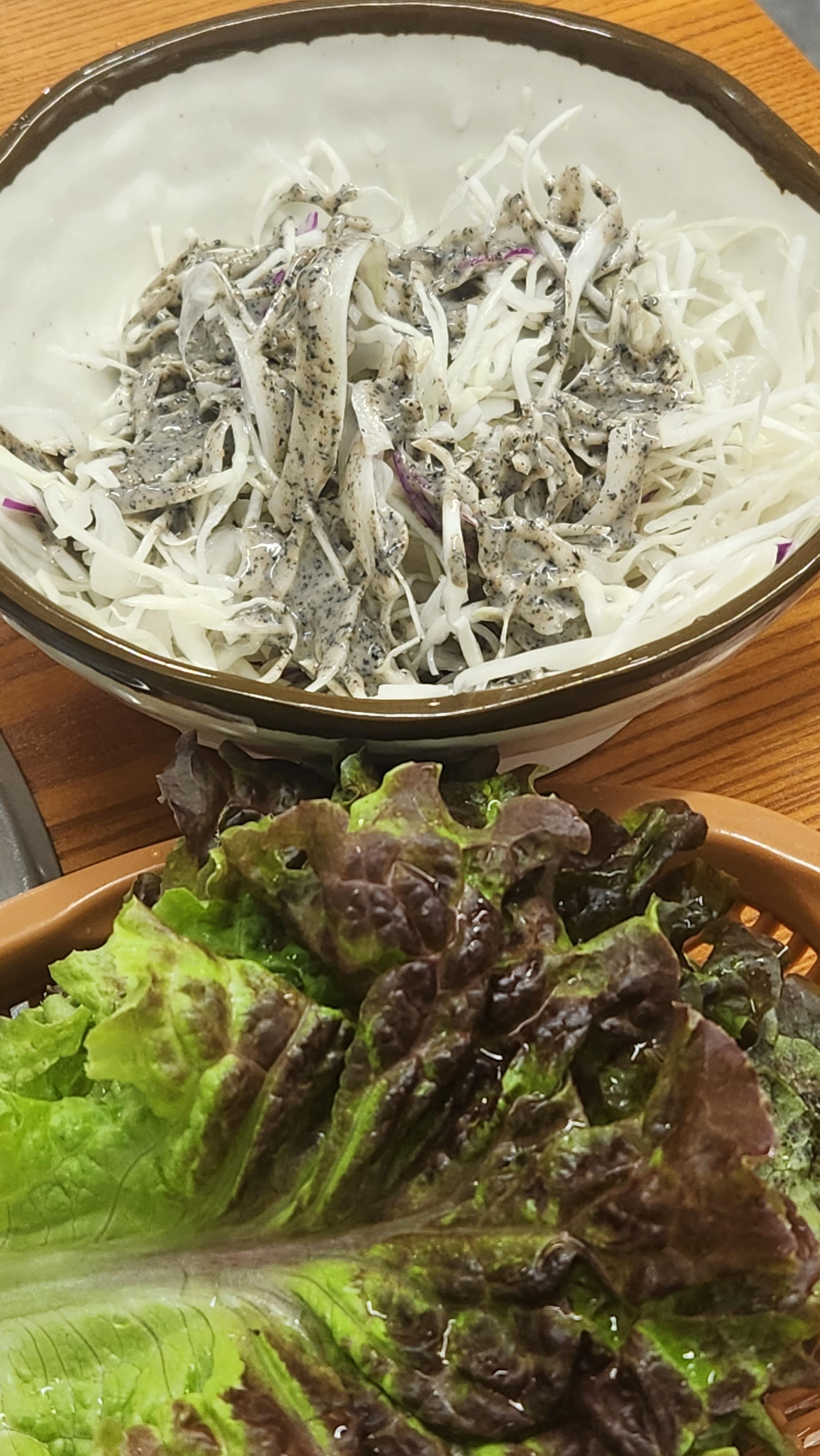 상추, 깻잎, 쌈무, 양배추, 흑임자소스, 쌈장